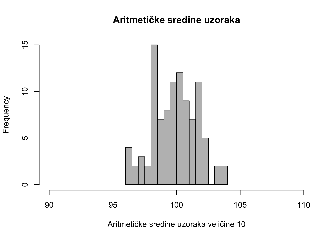 main = "Aritmetičke sredine uzoraka", xlim = c(90, 110))