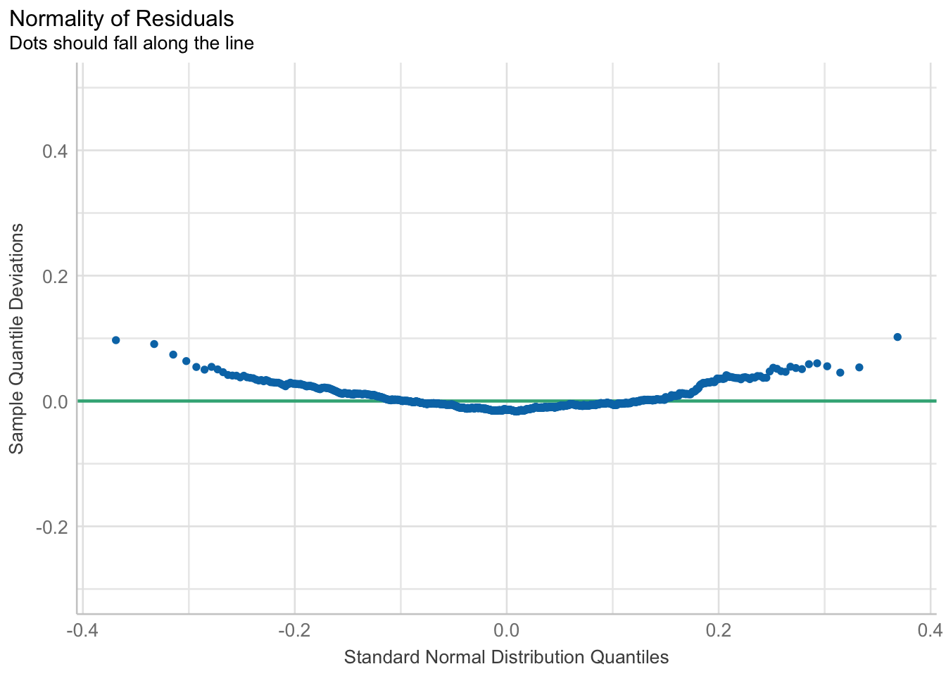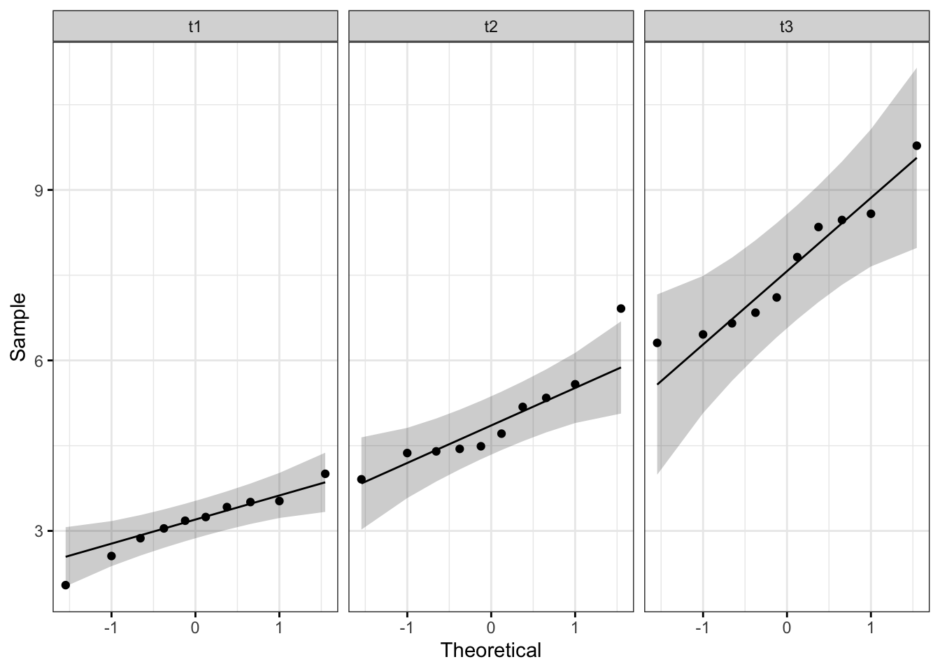 Iz q-q prikaza vidimo kako većina točaka pristaje uz liniju. Uz dodatak raspona, možemo biti još sigurniji.