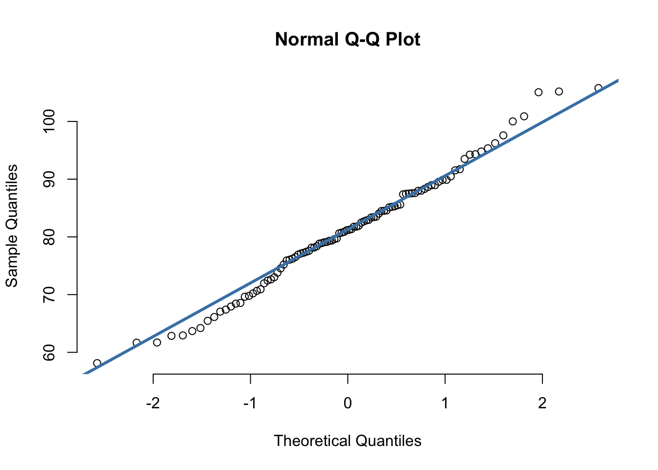 uzorak_tezina_1 <- c(rnorm(100, mean = 80, sd = 10))qqnorm(uzorak_tezina_1, pch = 1, frame = FALSE)