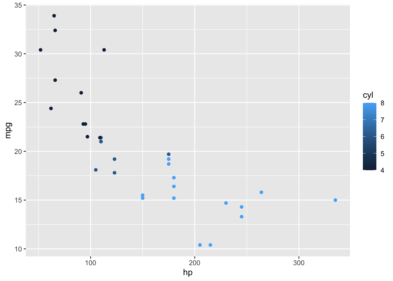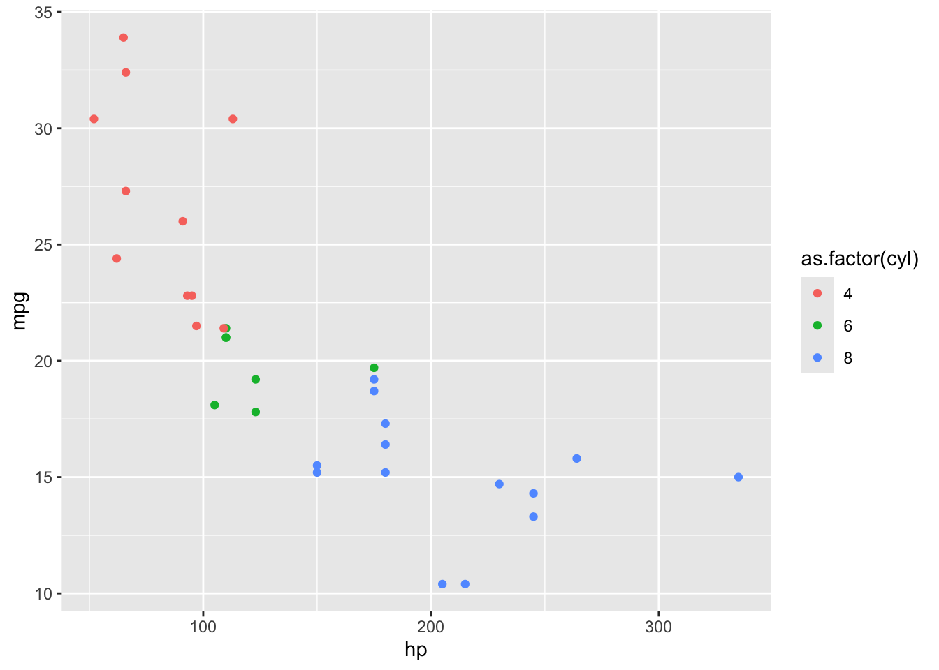 ggplot(mtcars, aes(x = hp, y = mpg, color =as.factor(cyl)))+geom_point()