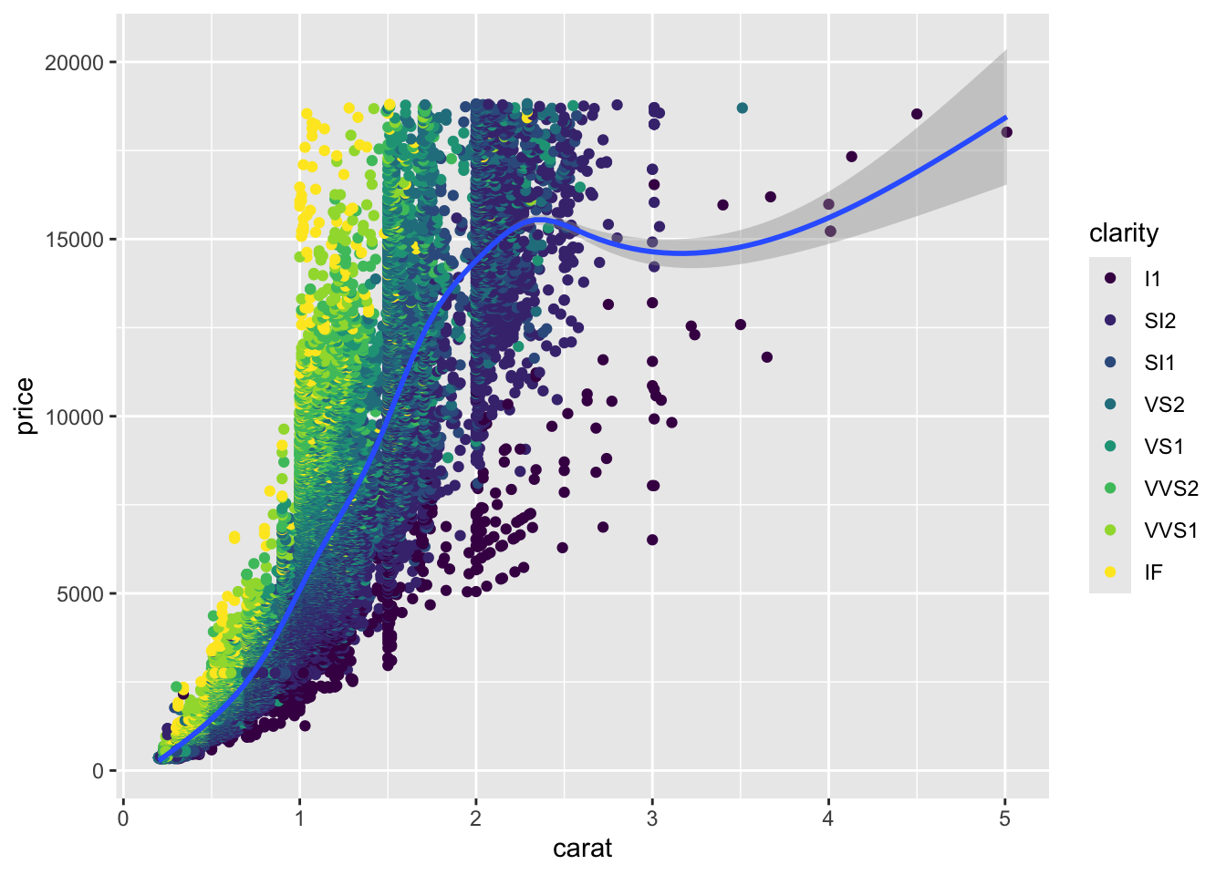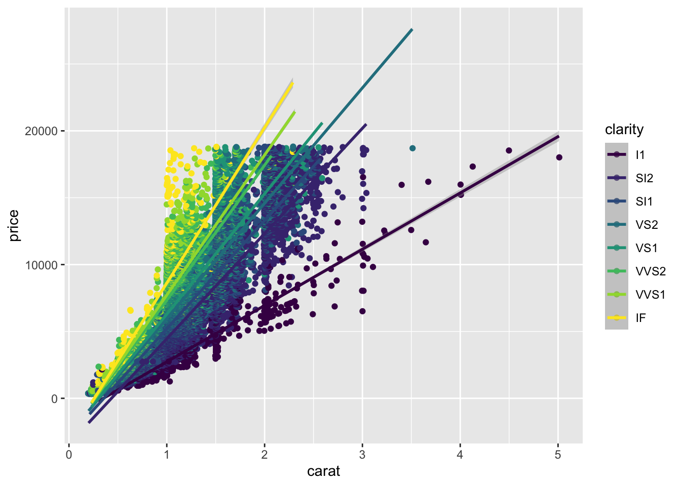 ggplot(diamonds, aes(carat, price, color = clarity))+geom_jitter()+geom_smooth(method ="lm")