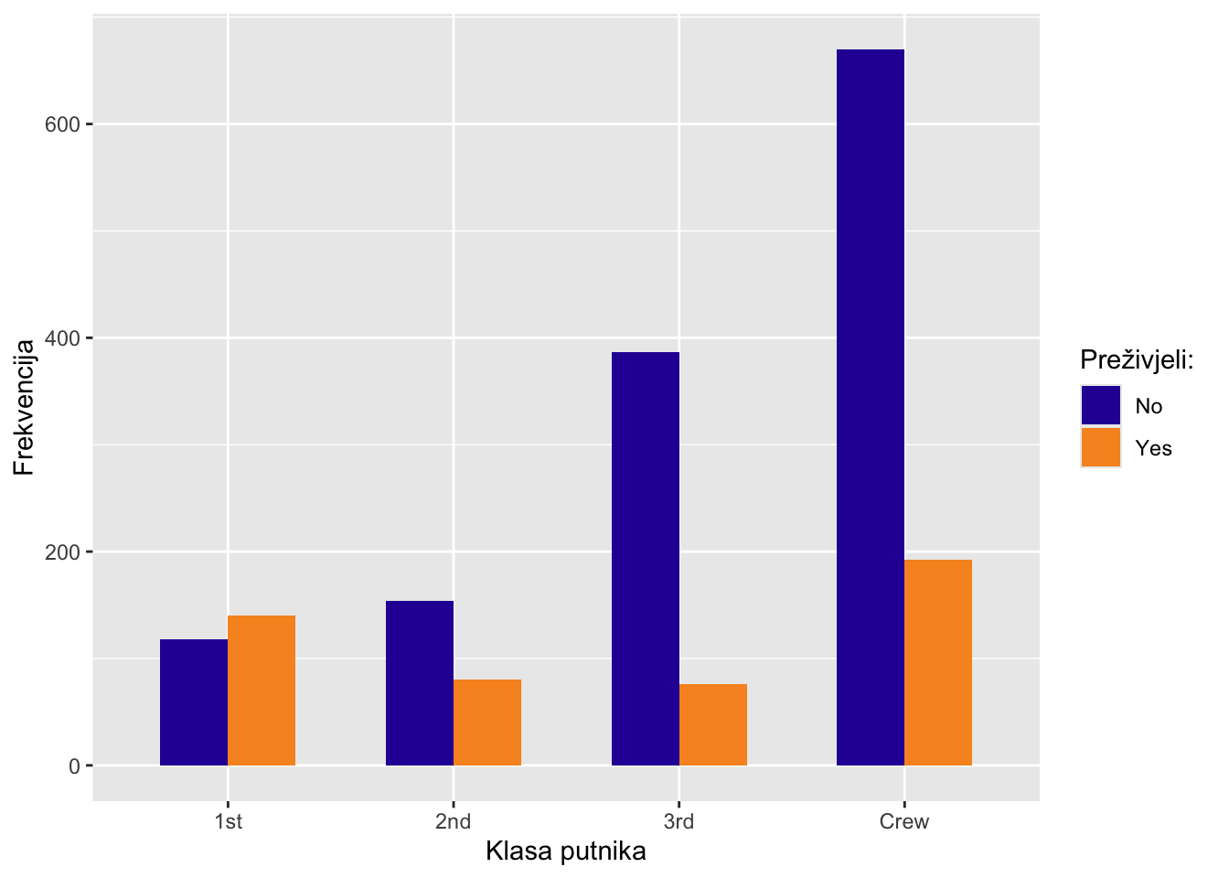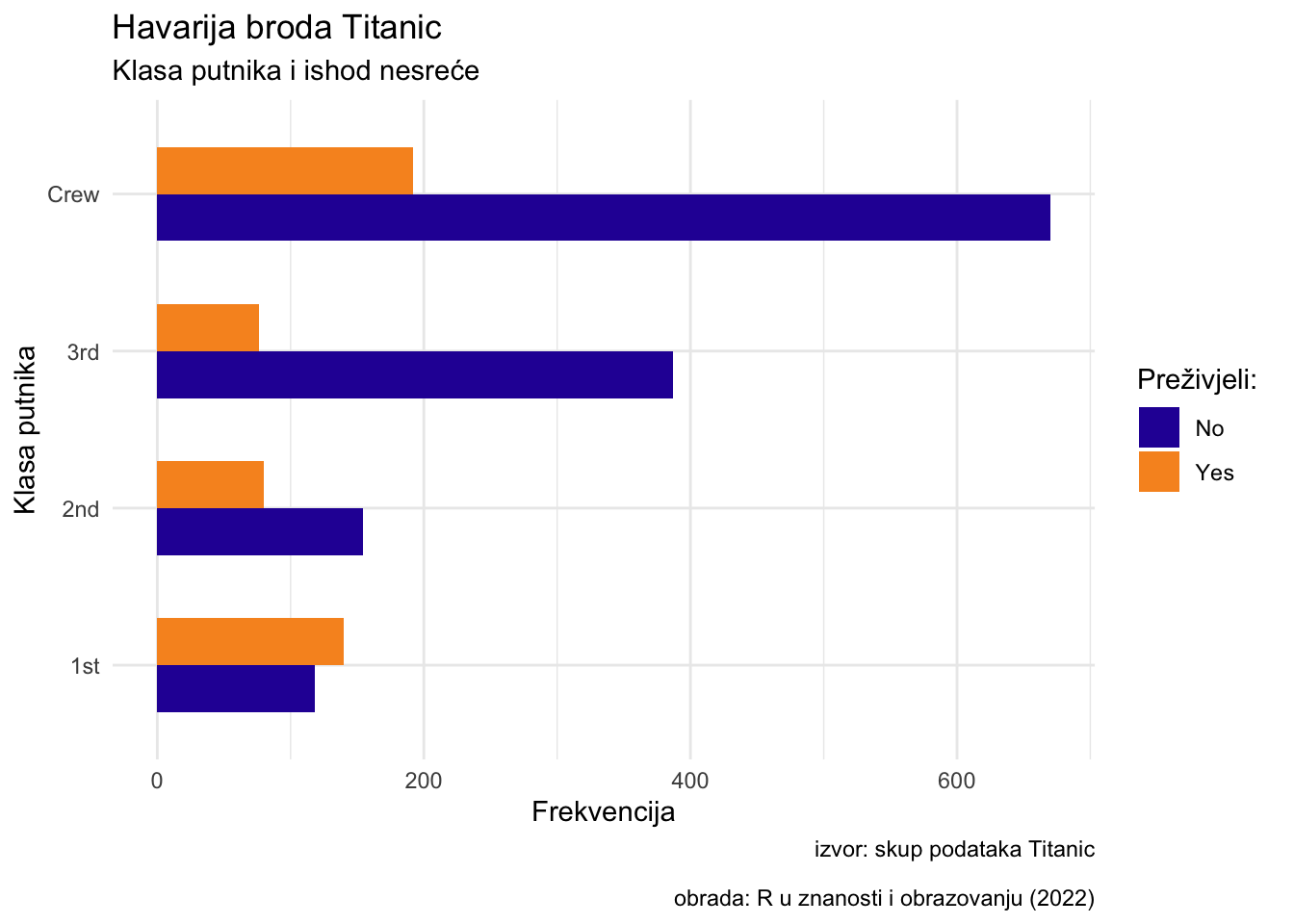Titanic <-as.data.frame(Titanic) ggplot(Titanic, aes(Class, Freq, fill=Survived))+geom_bar(stat ="identity", position ="dodge", width =0.6)+scale_fill_manual(values =c("#2a1ca4", "#f79425"))+labs(x ="Klasa putnika",y ="Frekvencija",fill ="Preživjeli: ",title ="Havarija broda Titanic",subtitle ="Klasa putnika i ishod nesreće",caption ="izvor: skup podataka Titanic\n obrada: R u znanosti i obrazovanju (2022)")+coord_flip()+theme_minimal()