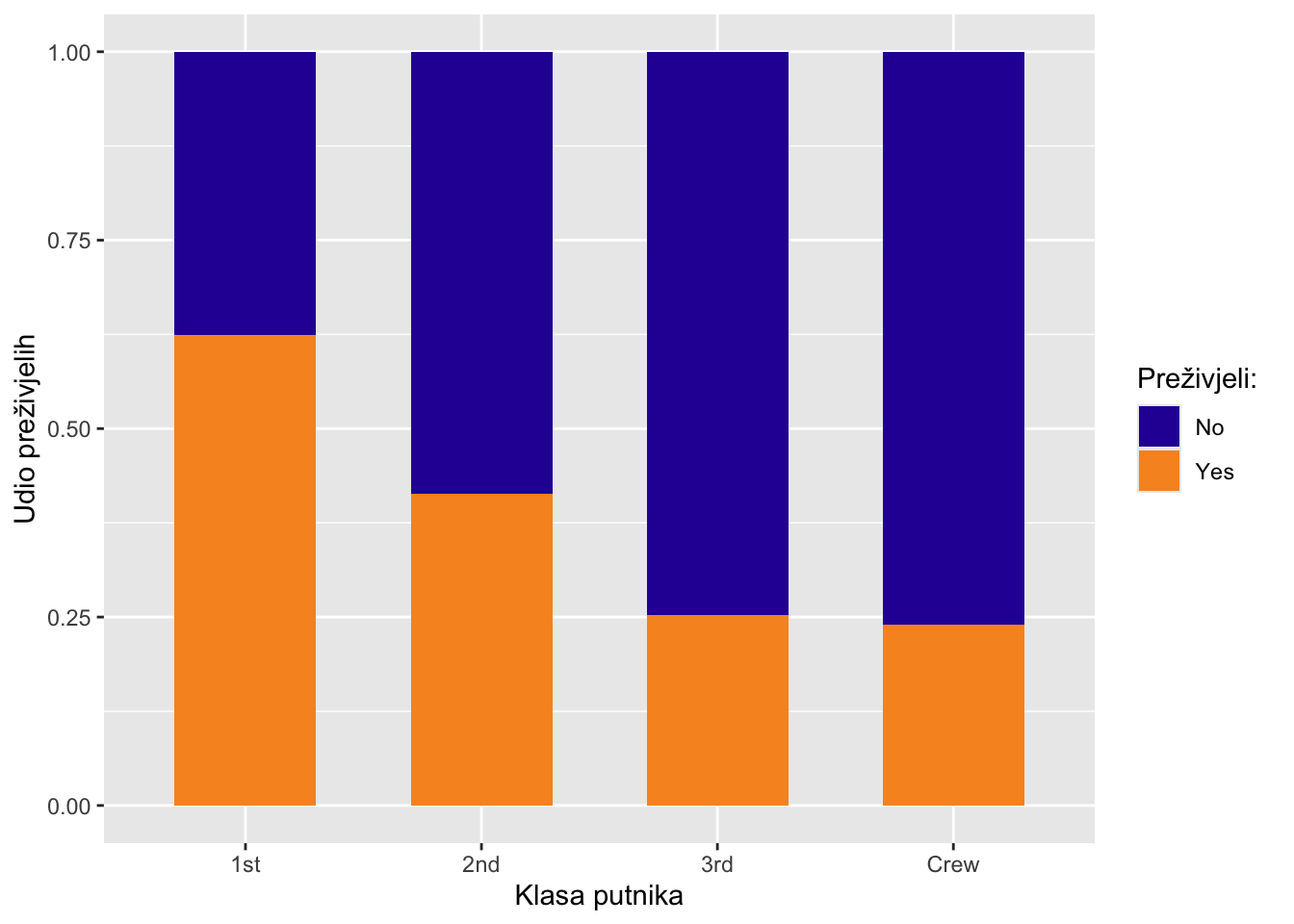Iz vizualizacije frekvencija očito je da putnika u prvoj i drugoj klasi ima bitno manje nego li onih u trećoj klasi ili posade. Ako želimo bolje usporediti same udjele preživjelih unutar skupine putnika, možemo promijeniti samo jednu opciju u prethodnom grafikonu, a to je pozicijska opcija unutar geom_bar() koju ćemo promijeniti u position = "fill". Sada ćemo dobiti grafikon s jednakom visinom stupaca odnosno udjele preživjelih u svakoj klasi putnika.