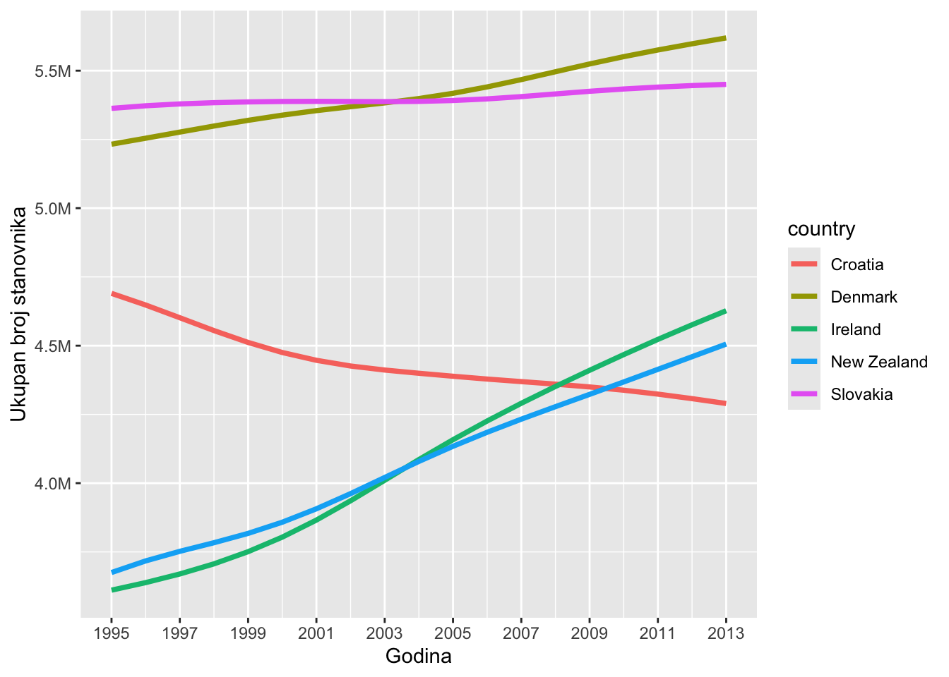 # odaberimo nekoliko zemalja od interesastanovnistvo <- population %>%filter(country %in%c("Croatia", "Denmark", "Slovakia", "Ireland", "New Zealand")) ggplot(stanovnistvo, aes(year, population, color = country))+geom_line(size=1.3)+scale_x_continuous("Godina", breaks =seq(1995,2013,2))+scale_y_continuous("Ukupan broj stanovnika", labels =label_number(scale_cut =cut_short_scale()))