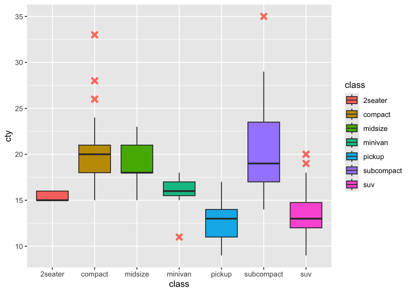 Ocije size, linetype i shape mijenjaju izgled linije ili točke. Na primjeru geom_boxplot() funkcije pogledajmo kako mijenjaju oblik izdvojenica sa argumentima outlier.shape i outlier.stroke kojim mijenjamo debljinu fonta. Svaki oblik ima svoju brojčanu oznaku.