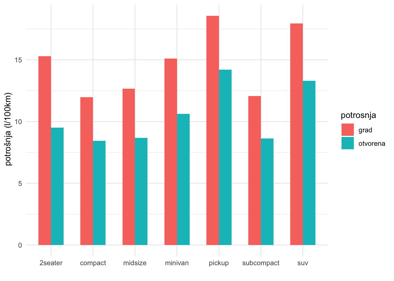Na primjeru skupa mpg, povežimo nekoliko radnji s crtanjem stupčastog grafikona. Cilj nam je prikazati potrošnju u gradu i na otvorenoj cesti za svaku vrstu automobila (varijabla “class”). Potrošnju u litrama na 100km dobit ćemo tako da 235,2 podijelimo s potrošnjom u miljama po galonu (mjerna jedinica potrošnje u skupu mpg).