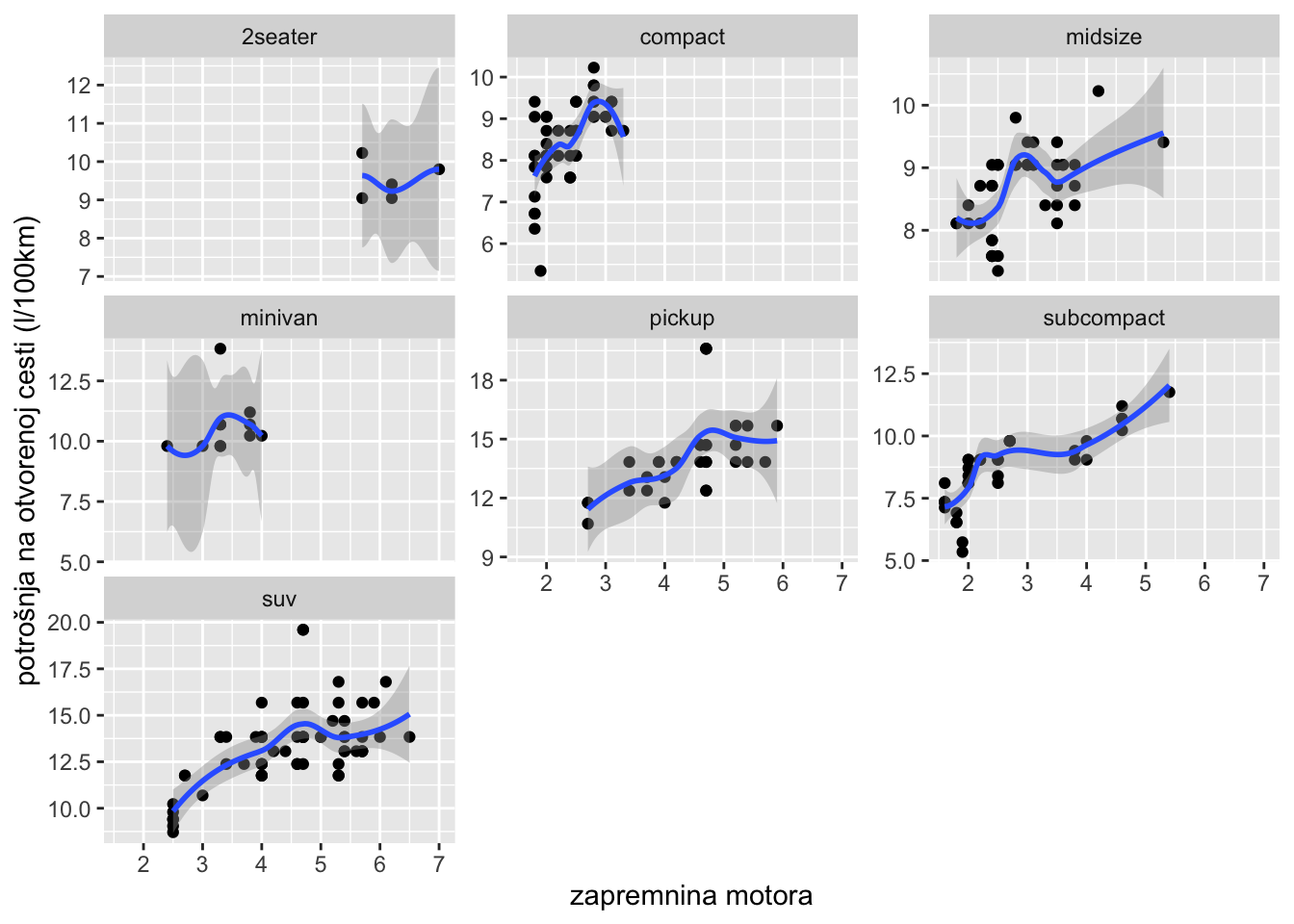 Koristeći funkciju facet_wrap() kreirali smo vizualizaciju podijeljenu na klase automobila. Jedini argument koji nam je bio potreban je varijabla kojom će facet_wrap() funkcija grupirati podatke, a on se piše unutar funkcije nakon oznake ~.