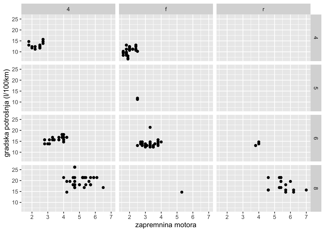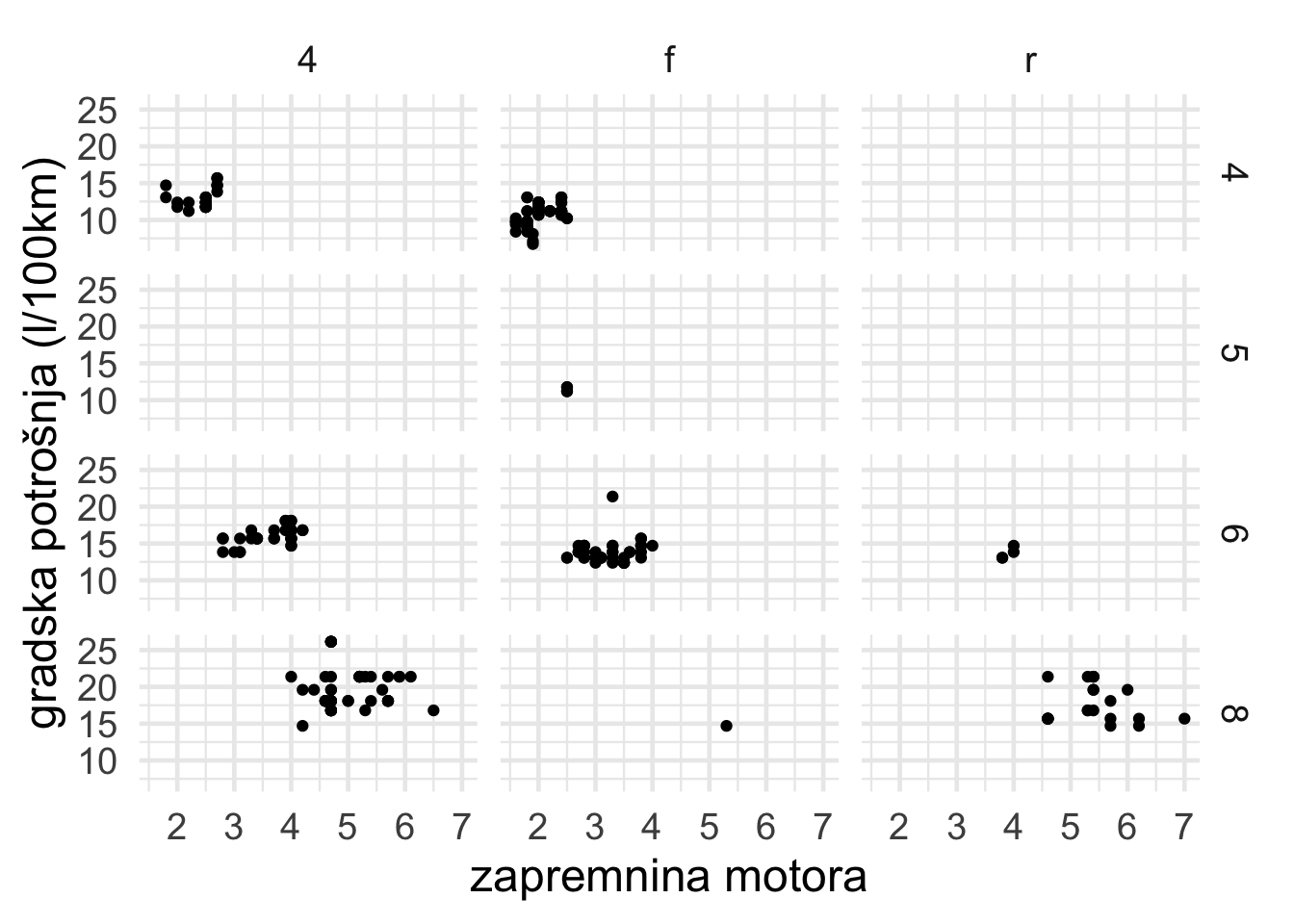 Kada želimo prikazati odnos između dvije varijable pomoću facet-a koristit ćemo funkciju facet_grid(). Nastavljajući se na naša prethodna dva primjera, dodajmo u facet-e odnos između pogonskih kotača (4x4, prednji i stražnji) i broja cilindara u motoru.