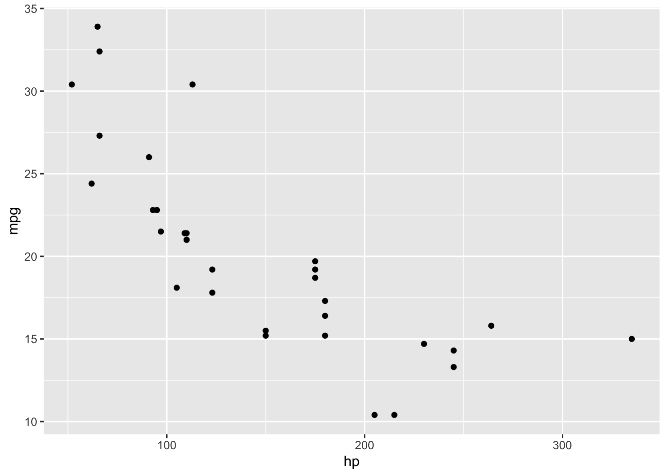 # kreirajmo grafikonggplot(data = mtcars)+geom_point(mapping =aes(x = hp , y = mpg))