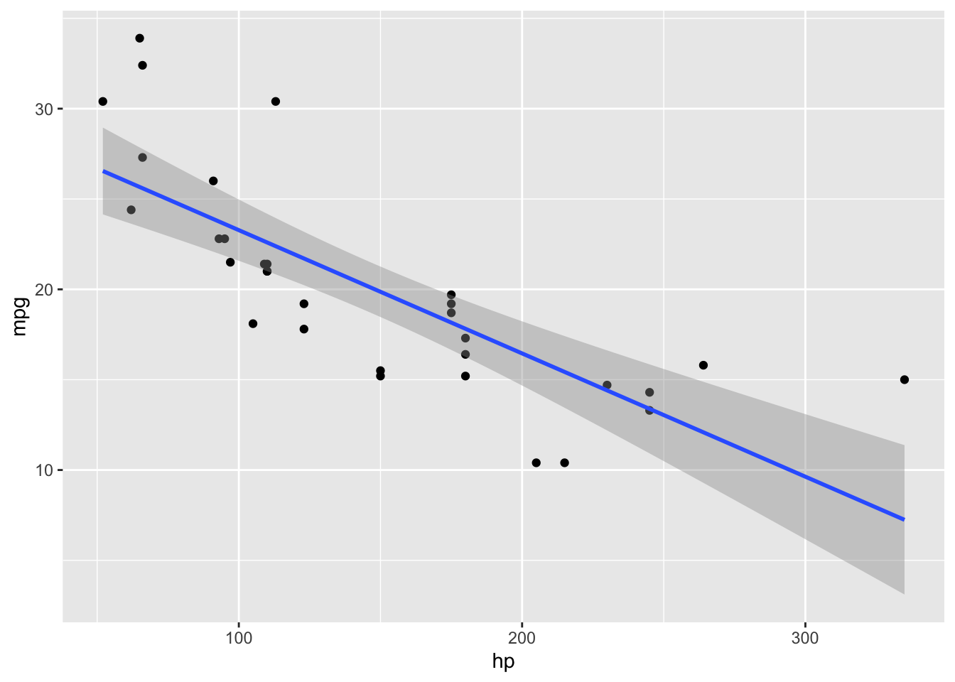 # točan, ali nepotrebno duži i stoga nekonvencionalan način:ggplot(mtcars)+geom_point(aes(x = hp , y = mpg))+geom_smooth(aes(x = hp , y = mpg), method ="lm")# točan, kraći i konvencionalan način:ggplot(mtcars, aes(x = hp, y = mpg))+geom_point()+geom_smooth(method ="lm")